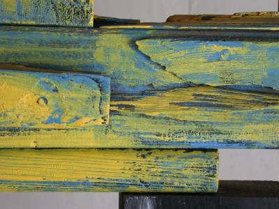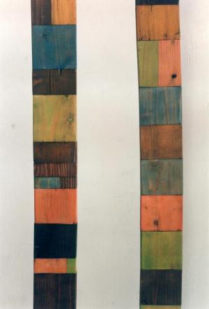 Although these non-representational works are concerned primarily with formal visual decisions, part of their “content” involves my visual reaction to Southern California when I relocated here from New York City in 1991. Some of the combinations of forms I observed, for example, bright reflective surfaces juxtaposed with indications of urban and biological decay, had an immediate visual attraction for me. I have tried to incorporate in these works the up-to-the-minute newness and constant re-invention of Los Angeles, together with aspects of its darker urban angst.